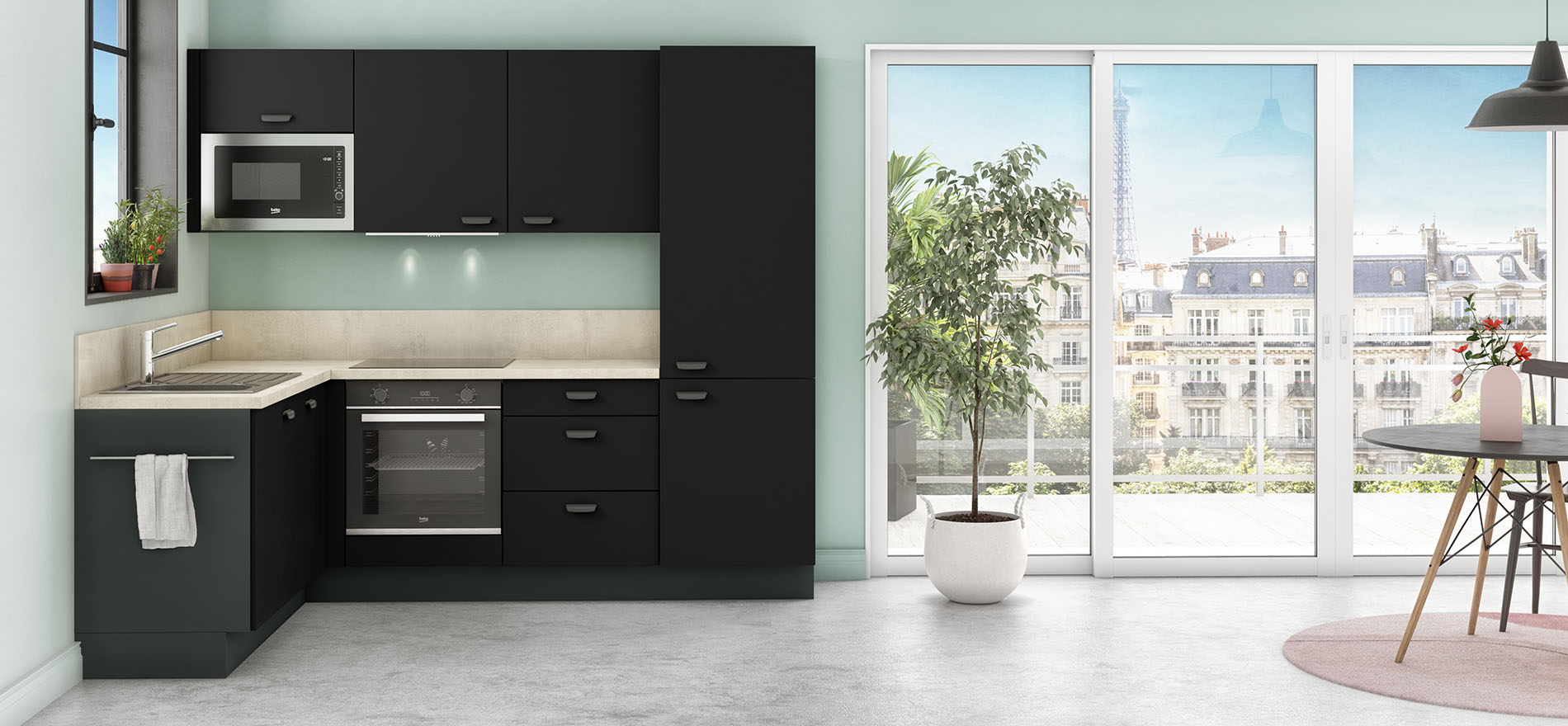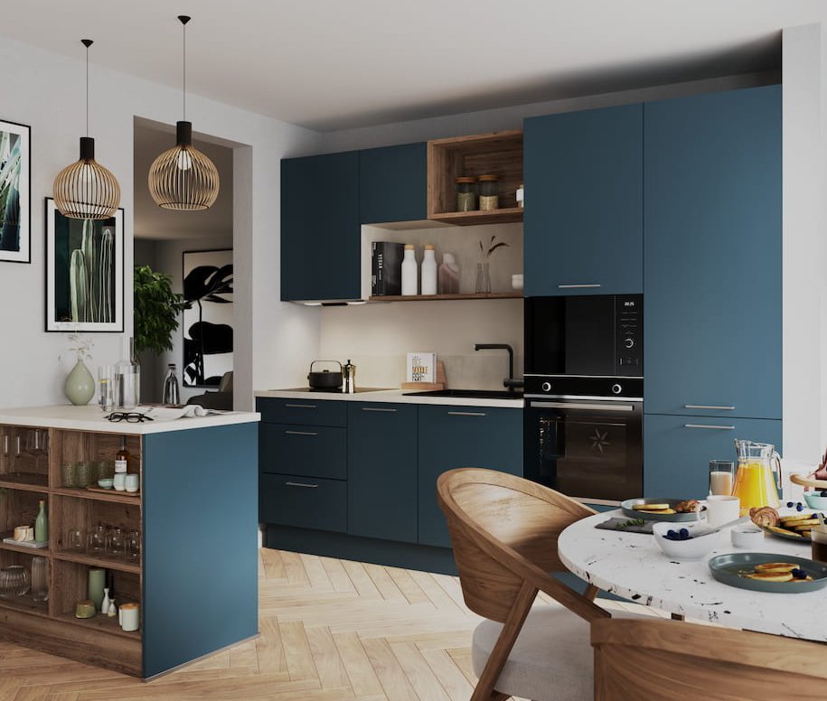 6,95 m de longueur avec ilôt, cette cuisine inclut les meubles bas et hauts, les façades colorées, les plans de travail, les poignées inox, et les plinthes assorties !