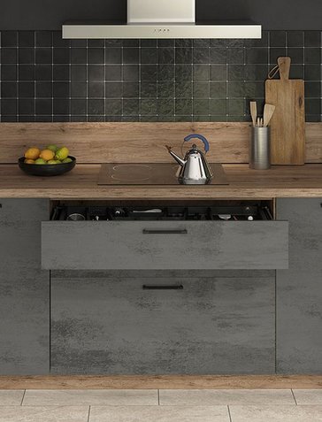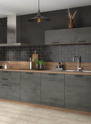 Notre offre de façades effet béton se décline dans une tonalité de gris : un béton ardoise plus soutenu, qui se mariera parfaitement dans une cuisine lumineuse ou bien éclairée, et un béton clair, qui s’adapte à absolument tous les styles et toutes les couleurs de sol, de murs et de carrelages. Pensez à choisir une crédence, intégrée dans notre offre, qui s’harmonisera avec la tonalité que vous recherchez : un effet béton dominant ou, au contraire, un joli contraste entre le brut et la couleur.