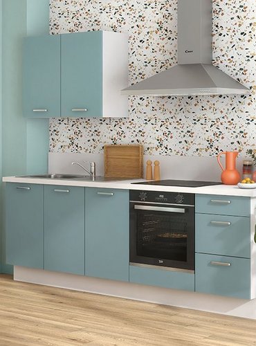 Puisque vous n’avez qu’un pan de mur, autant bien l’utiliser, et en exploiter le moindre centimètre. Ça tombe bien, avec Cake Kitchen, vous payez votre cuisine en fonction de vos mètres linéaires. Les cuisines en i se marient en général bien avec un grand plan de travail, mais il va falloir vous discipliner un peu pour qu’il soit bien rangé et qu’on n’ait pas plutôt l’impression d’entrer dans la salle de jeux des enfants…Pensez à bien optimiser vos rangements tout en créant un style épuré pour garder une cohésion dans votre pièce.