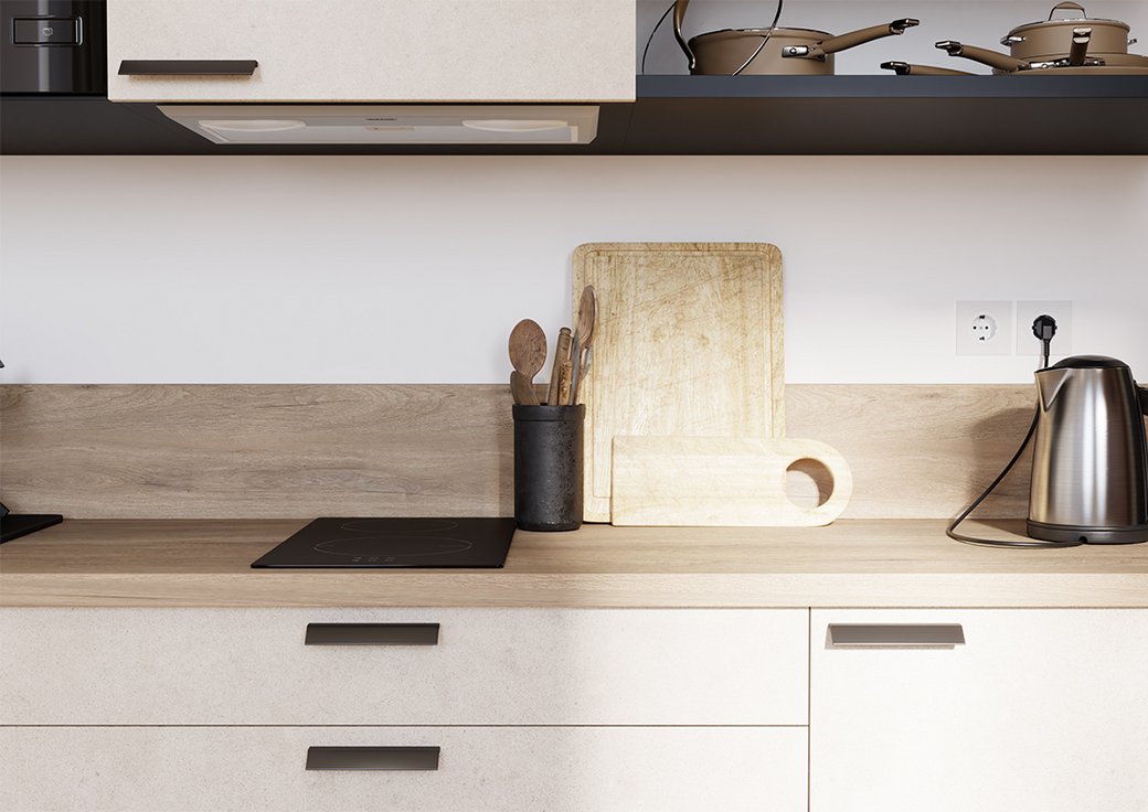 Cette cuisine équipée compacte a été conçue pour s’intégrer dans les espaces restreints comme les studios en mezzanine ou les petits appartements. Avec ses caissons noirs épurés, ses façades beiges effet béton sable, et son plan de travail effet chêne maître, son style est à la fois contemporain et chaleureux.