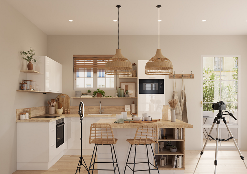 Le décor bois du plan de travail et de la crédence souligne joliment la naturalité de vos compositions. Outre son caractère esthétique, la cuisine est particulièrement ergonomique pour se prêter aux mises en scène les plus inspirantes. Si vous aimez le monochrome, vous pouvez aussi opter pour une cuisine blanche avec un plan de travail en marbre.