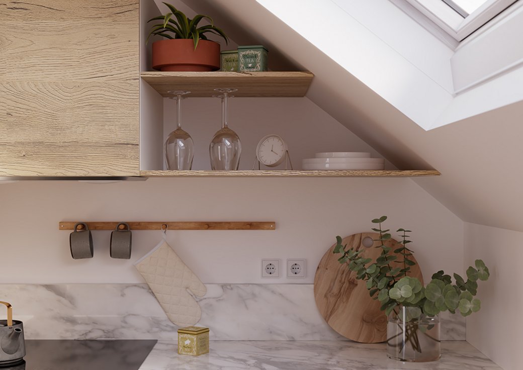 Imaginez un matin ensoleillé, une lumière douce filtrant à travers les fenêtres pour illuminer votre toute nouvelle cuisine sous les toits, conçue sur mesure. Les façades blanches, aux finitions soyeuses, se marient délicatement avec le plan de travail effet marbre Venato Bianco : une composition pensée pour combiner fonctionnalité et un brin de sophistication, dans un espace en double II parfaitement organisé.Le mariage de l’effet marbre, avec son veinage naturel, et de l’effet bois, synonyme de chaleur, crée une atmosphère à la fois fonctionnelle, accueillante et esthétique.