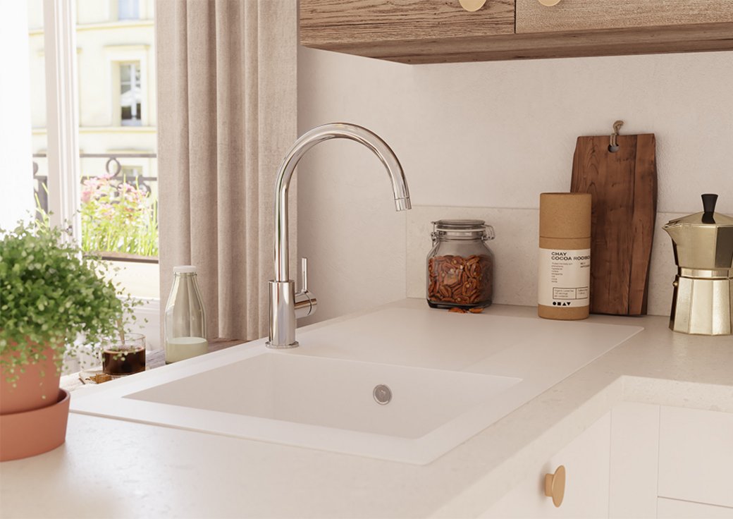 un évier encastré Franke Orion en blanc et un mitigeur Franke Lina J renforcent son style épuré et lumineux.