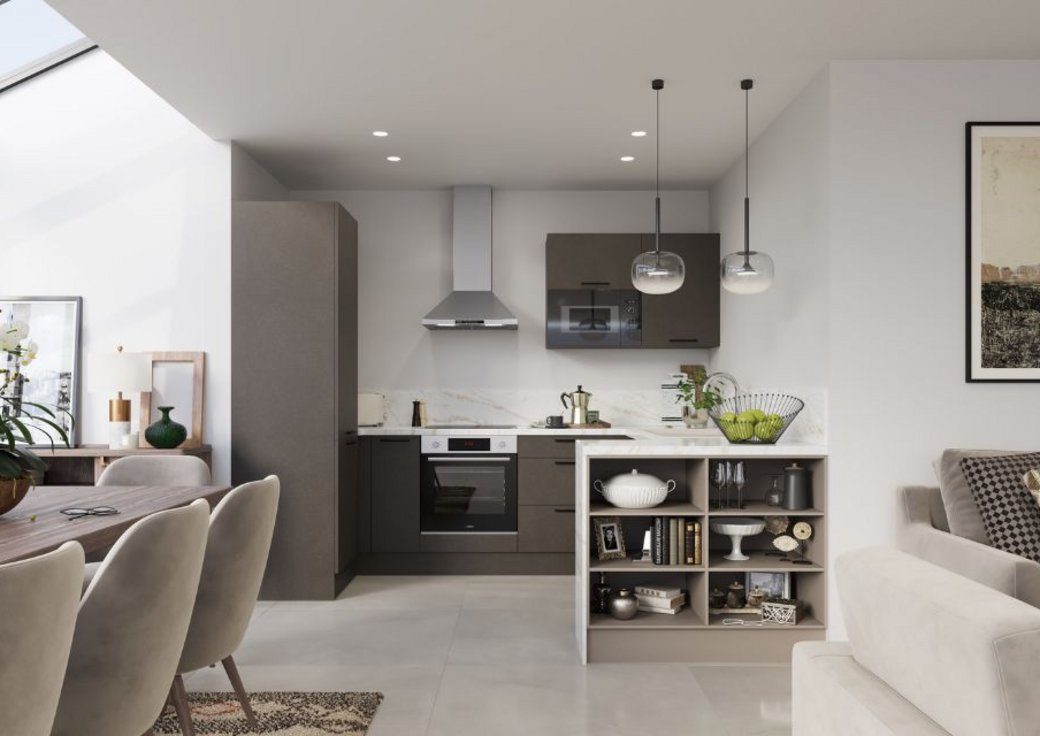 L'ergonomie générale de cette cuisine est importante, notamment avec la concentration de rangements hauts et bas, et le retour astucieux de la partie en G. Les appareils électroménagers en option sont encastrés, ce qui accentue encore l'impression d'unité.