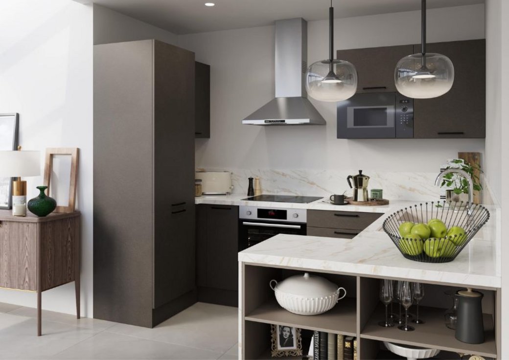 L'unité de couleur des meubles, avec la touche métallique des poignées, capte très joliment la lumière. Surtout si vous avez la chance de disposer de fenêtres dans votre cuisine. Même si ce n'est pas le cas, de beaux luminaires donneront de la profondeur à cet ensemble couleur café et effet marbre.. Ajoutez-y une carafe ou un vase de caractère, une collection choisie de faïences ou quelques beaux objets ramenés de voyage, et votre cuisine deviendra un véritable écrin pour accueillir dignement vos amis et votre famille. Grâce à notre outil de conception de cuisine en 3D, vous pouvez déjà visualiser votre cuisine équipée !