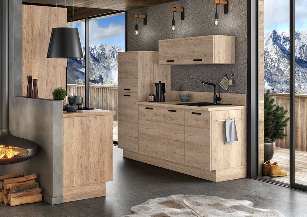Le décor chêne habille à la fois les façades des meubles, les plinthes et le plan de travail, pour former une impression d’unité, dans un esprit montagnard, comme dans un chalet. Si vos deux murs sont suffisamment éloignés l’un de l’autre, pensez à installer une table pour pouvoir manger au centre de la pièce.