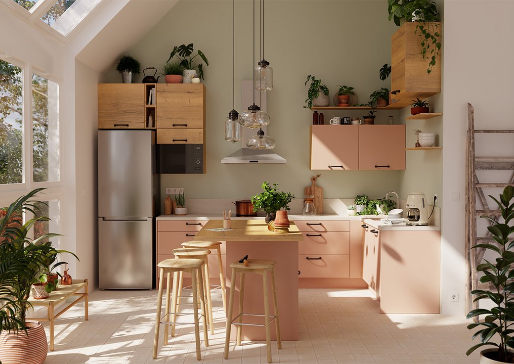 Conçue dans un esprit de nature, la cuisine corail et bois est à l’écoute des saisons. La couleur corail, très tendance, incarne à la fois la douceur et la vitalité. Associé aux éléments en chêne Sierra et au plan de travail béton sable, c’est un coloris délicat qui s’épanouit avec subtilité dans votre cuisine. Pour une atmosphère encore plus épurée, associez le corail et le bois avec des tons neutres comme le beige, le blanc ou le gris. Si vous préférez une cuisine équipée plus design, osez des couleurs plus audacieuses, dans la gamme des verts ou des bleus, ou plus sobres comme un noir industriel.