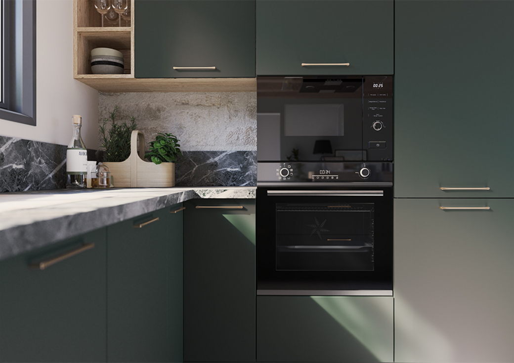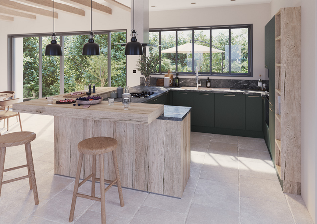 Le mélange des matériaux et des effets contribue à cette impression d'espace : un plan de travail de belles dimensions tranche élégamment avec l'effet bois des caissons extérieur et du coin repas. Les façades de meubles, vert minéral, ajoutent la touche de nature nécessaire et rappellent l'élégance britannique. C'est une cuisine spacieuse, qu'on s'approprie comme une véritable pièce de vie familiale, où cuisiner devient une activité collective, où les liens se tissent au fil des repas. Grâce à notre outil de conception de cuisine en 3D, vous pouvez déjà visualiser votre cuisine équipée !