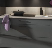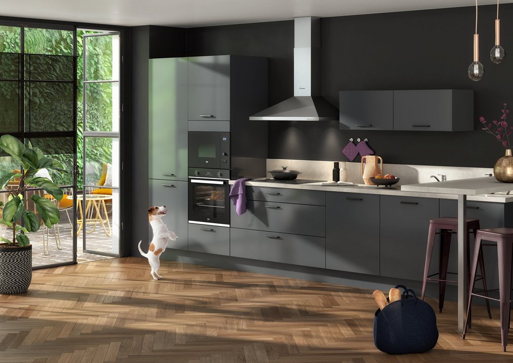 La combinaison des différents éléments sombres des façades, du plan de travail béton sable fin et des poignées confère à l’ensemble un style industriel indémodable.