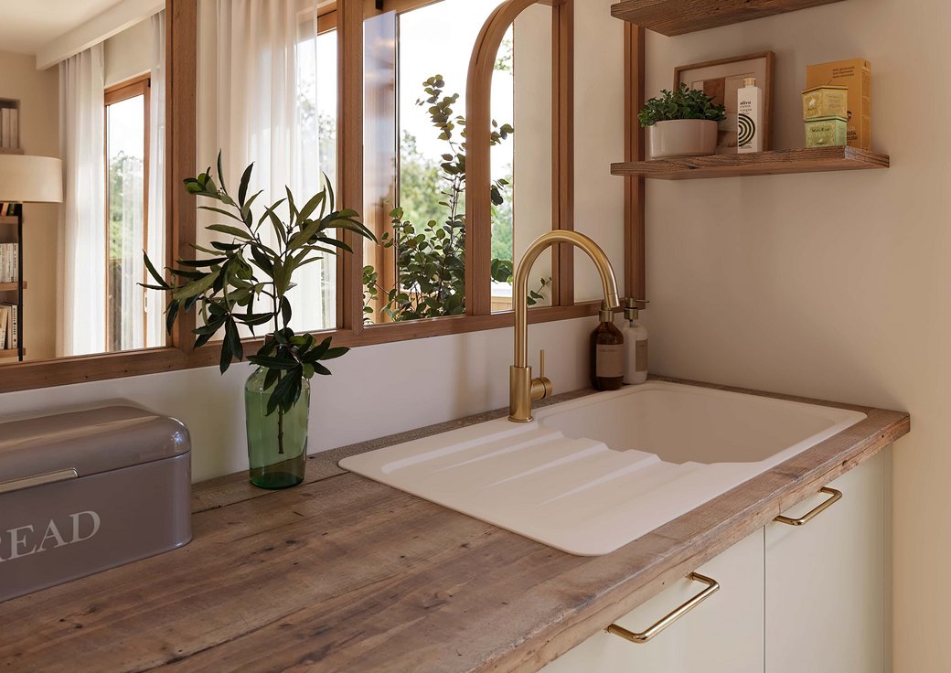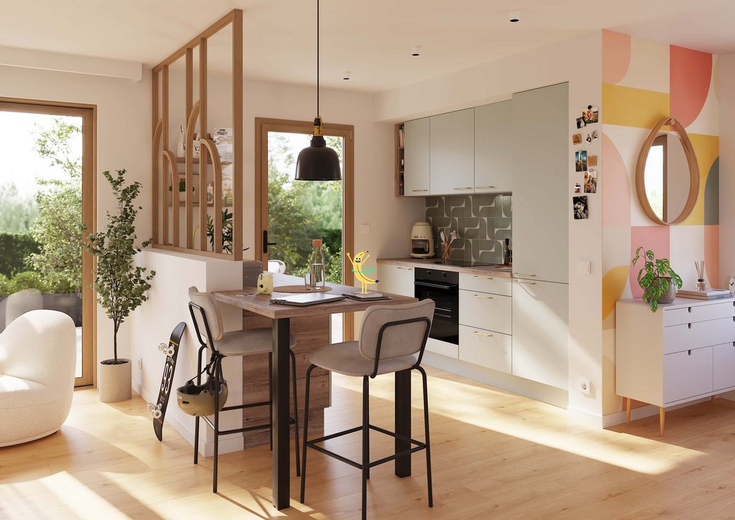 Le Vert Jade se marie à merveille avec des matériaux naturels et des éléments contemporains. Le bois reste l’association la plus évidente : il apporte immédiatement de la chaleur et équilibre la fraîcheur de la couleur Vert Jade. Les détails métalliques dorés fonctionnent également très bien avec cette palette ; ils ajoutent une touche lumineuse et élégante qui met en valeur les façades vertes sans alourdir l’ensemble. Dans une maison de ville, la verrière intérieure est un élément décoratif intéressant : elle structure l’espace, laisse circuler la lumière et renforce le style contemporain de la cuisine. Pour personnaliser le tout, il suffit d’ajouter quelques touches décoratives : plantes vertes, céramiques, suspensions originales ou étagères ouvertes pour exposer de jolis objets du quotidien.