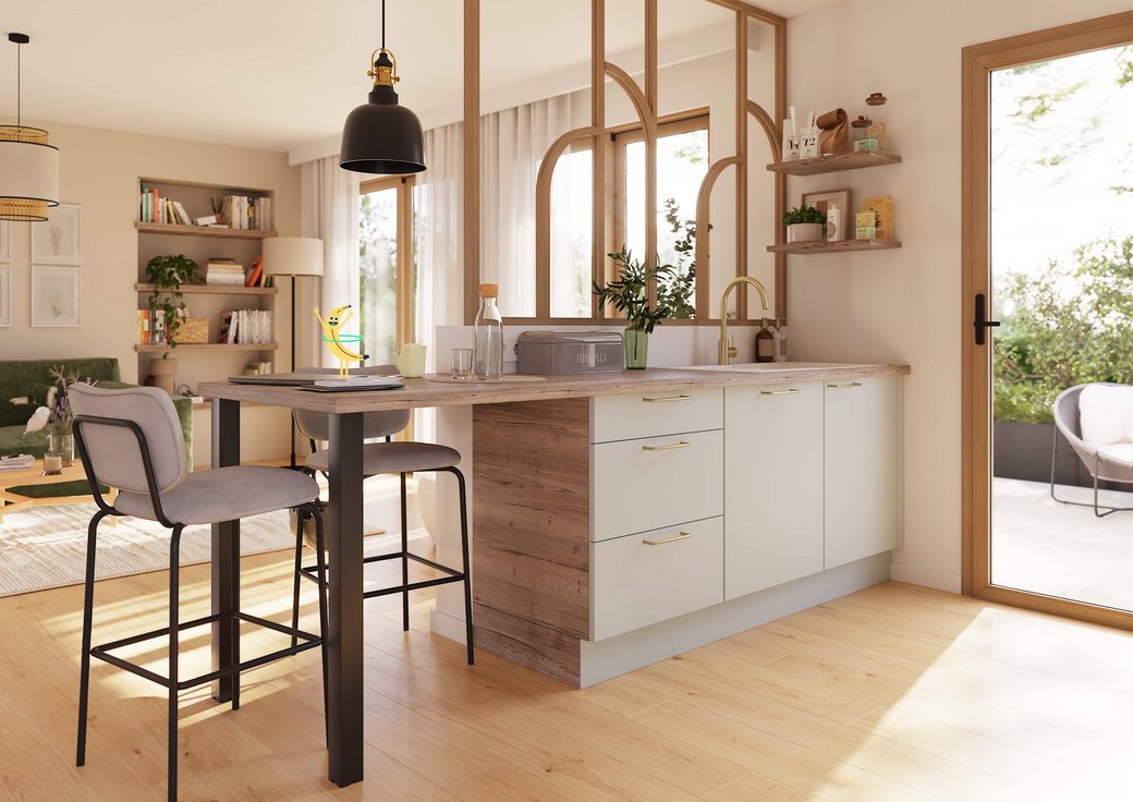 L’implantation parallèle, aussi appelée cuisine en II, consiste à organiser les meubles sur deux linéaires face à face. Cette configuration est particulièrement efficace pour structurer un espace en longueur ou une cuisine semi-ouverte. Les zones de lavage, de cuisson, de préparation et de rangement se répartissent sur les deux linéaires pour une organisation fluide. Cette séparation naturelle des activités rend les gestes du quotidien plus fluides et limite les déplacements inutiles. Les appareils encastrés contribuent à maintenir l’harmonie de l’ensemble : rien ne dépasse, tout s’intègre dans la continuité du mobilier. Le passage central permet de circuler facilement entre les deux côtés de la cuisine, même lorsque plusieurs personnes s’y trouvent en même temps : une organisation particulièrement appréciable dans les maisons familiales. Quant au coin repas intégré, il joue un rôle de transition entre la cuisine et le salon ou la salle à manger. Il permet de s’installer rapidement pour un petit-déjeuner ou une discussion improvisée, tout en conservant un lien avec le salon, grâce à la verrière qui ouvre l’espace.