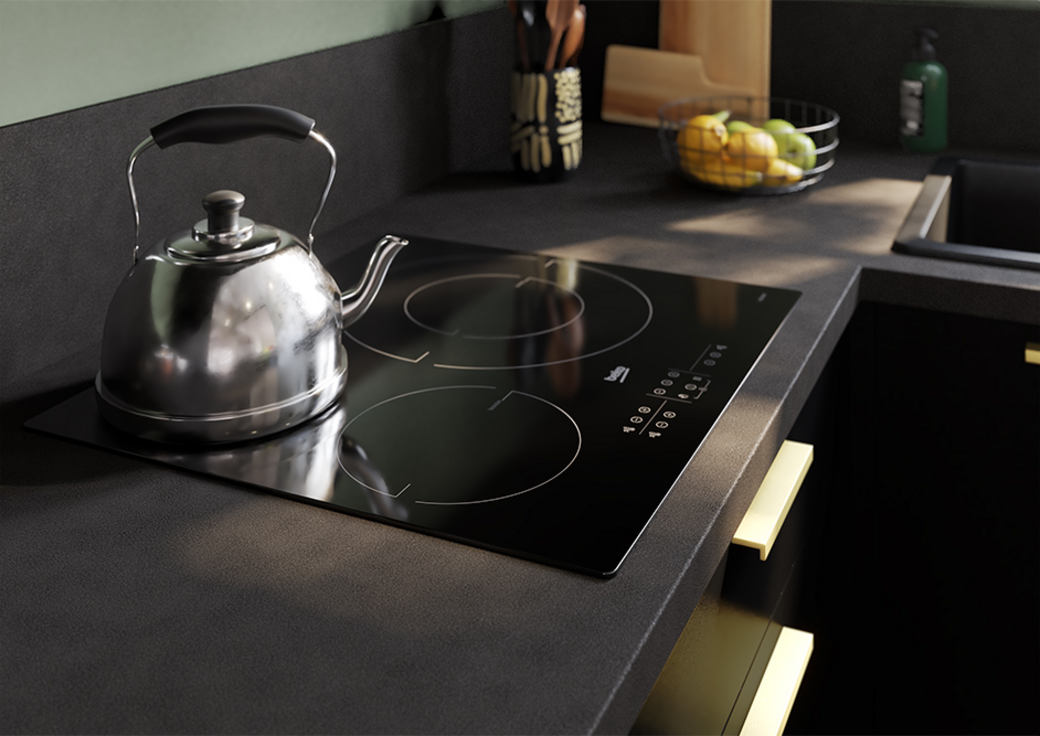 5 électroménagers - une table de cuisson, une hotte, un four, un réfrigérateur, un micro-ondes- se répartissent dans une configuration en L, avec un évier et un mitigeur.