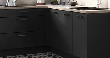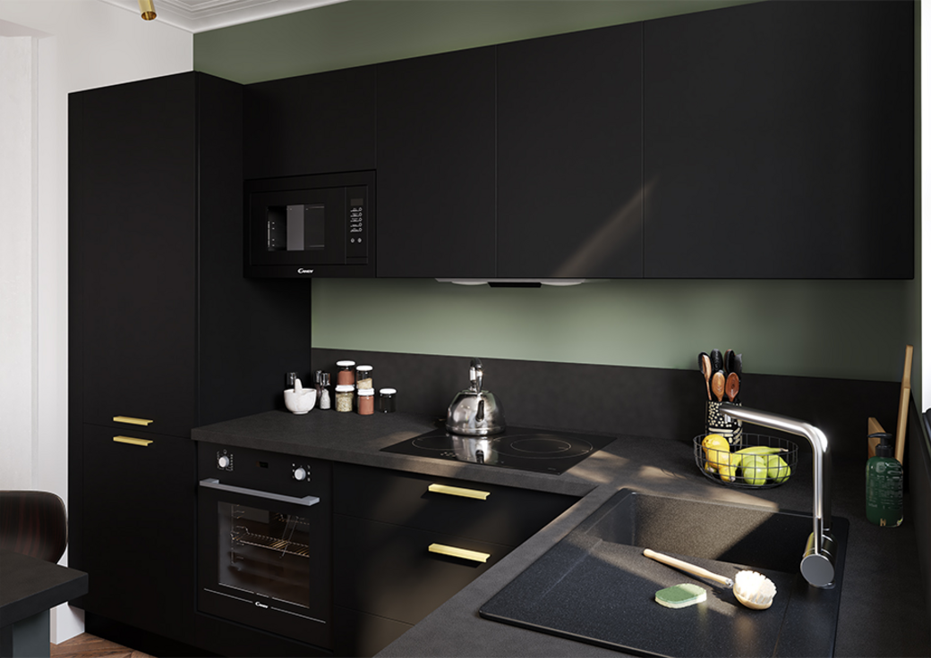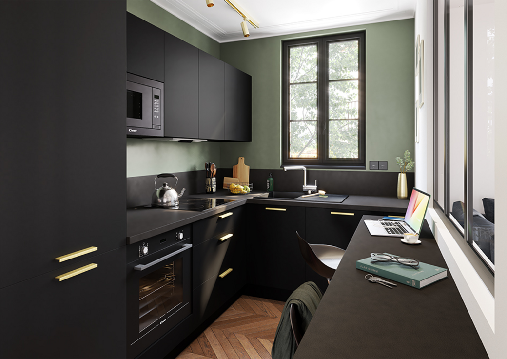 Sa configuration en L permet de combiner à la fois la dimension cuisine et coin repas. La dominante de couleur noire offre l’avantage d’un ensemble structuré, fini et homogène, renforcé par le côté mat qui lui donne beaucoup de caractère. En jouant avec les différentes sources de lumière de votre pièce, vous pourrez accentuer ce côté boudoir propre aux cuisines où l’on se sent bien, instantanément.