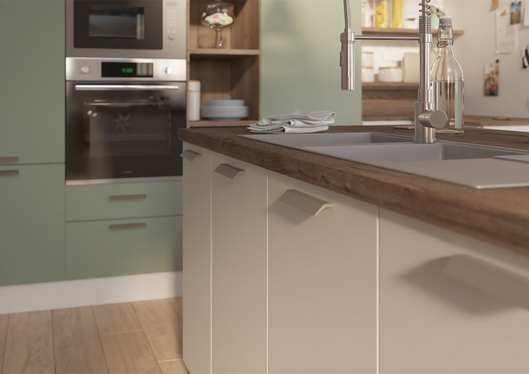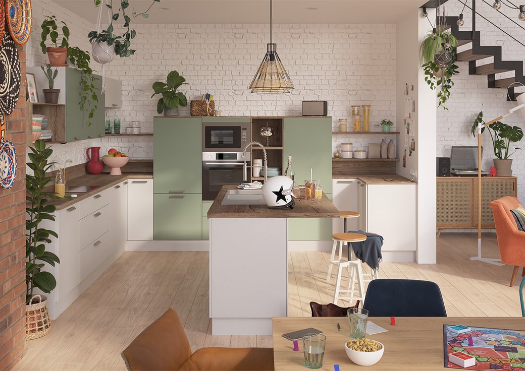 Le principe numéro 3 est la convivialité. Même si la vocation première d'une cuisine est d'être fonctionnelle, cet agencement est prévu pour faciliter les relations sociales entre les convives, le temps d'un déjeuner rapide ou d'un café qui se transforme en réunion improvisée ou en discussion à bâtons rompus. L'îlot est un atout pour improviser ce genre de moments, autour d'une salade ou d'une pause-goûter. Quelques tabourets hauts, coordonnés à l'effet bois du plan de travail, contrasteront joliment avec le gris soie des meubles et le ton jade de certains éléments, élégamment disséminés dans l'ensemble.