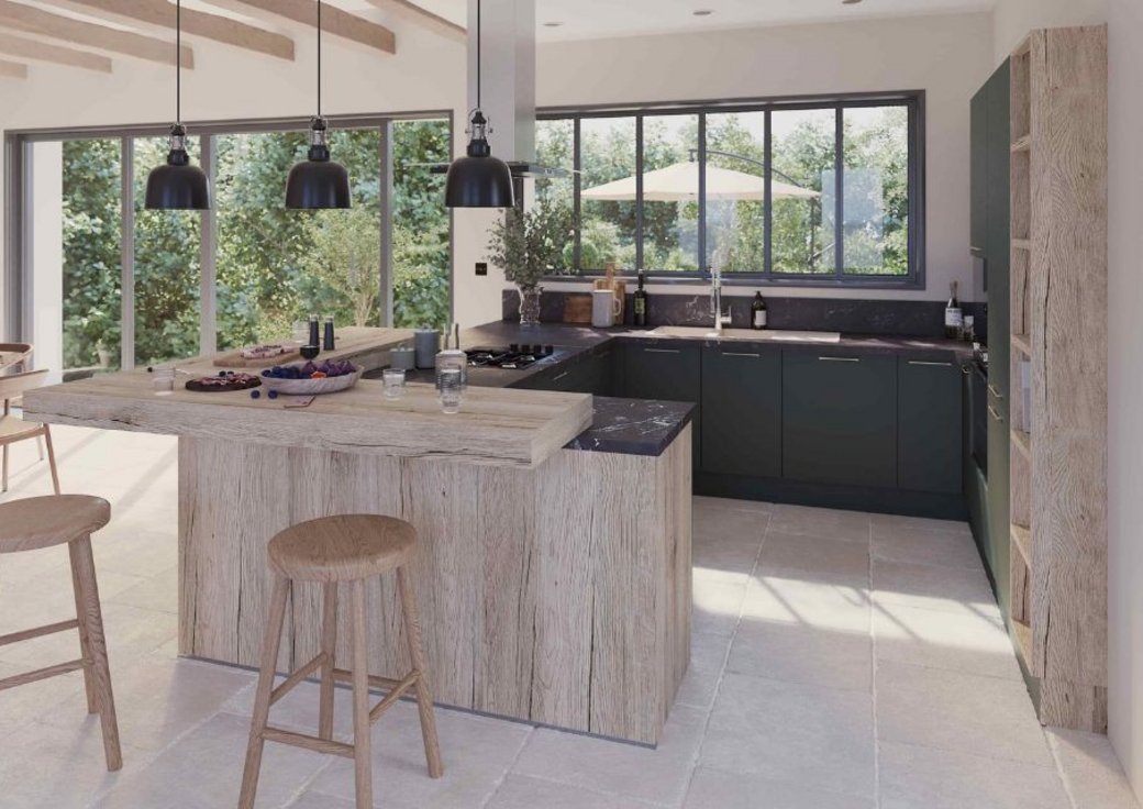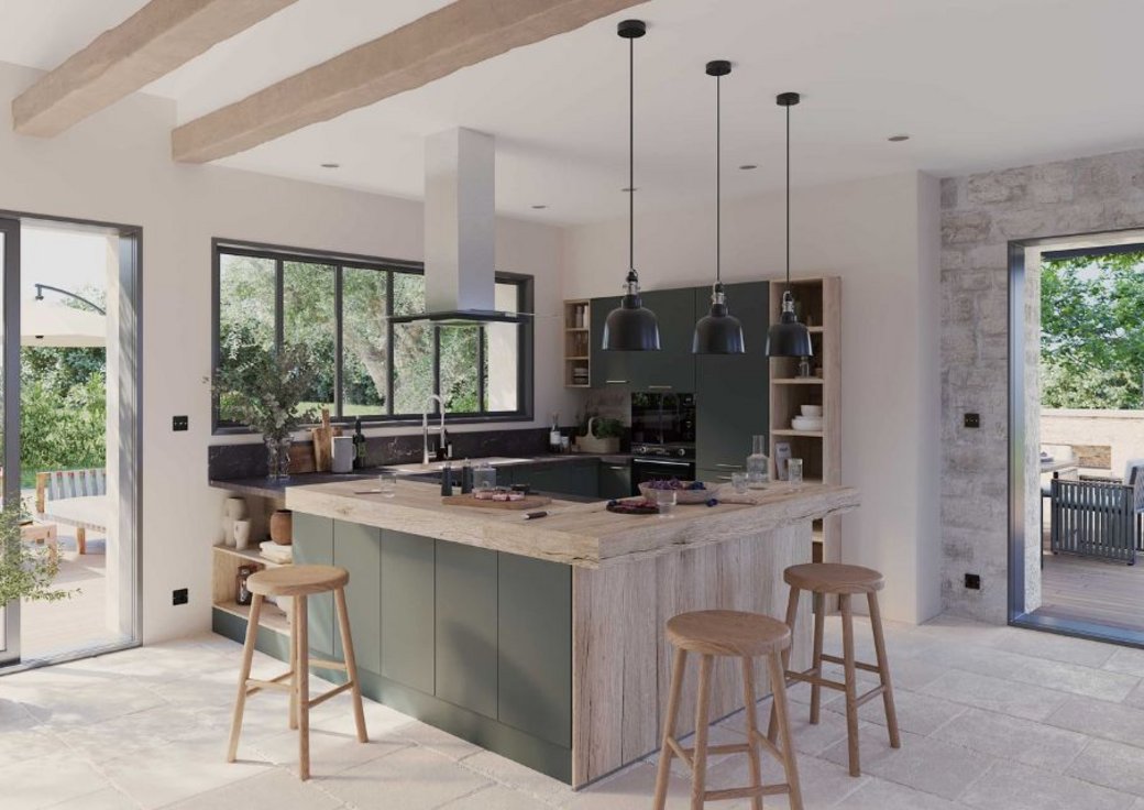 Le mélange des matériaux et des effets contribue à cette impression d'espace : un plan de travail de belles dimensions tranche élégamment avec l'effet bois des caissons extérieur et du coin repas. Les façades de meubles, vert minéral, ajoutent la touche de nature nécessaire et rappellent l'élégance britannique. C'est une cuisine spacieuse, qu'on s'approprie comme une véritable pièce de vie familiale, où cuisiner devient une activité collective, où les liens se tissent au fil des repas. Grâce à notre outil de conception de cuisine en 3D, vous pouvez déjà visualiser votre cuisine équipée !