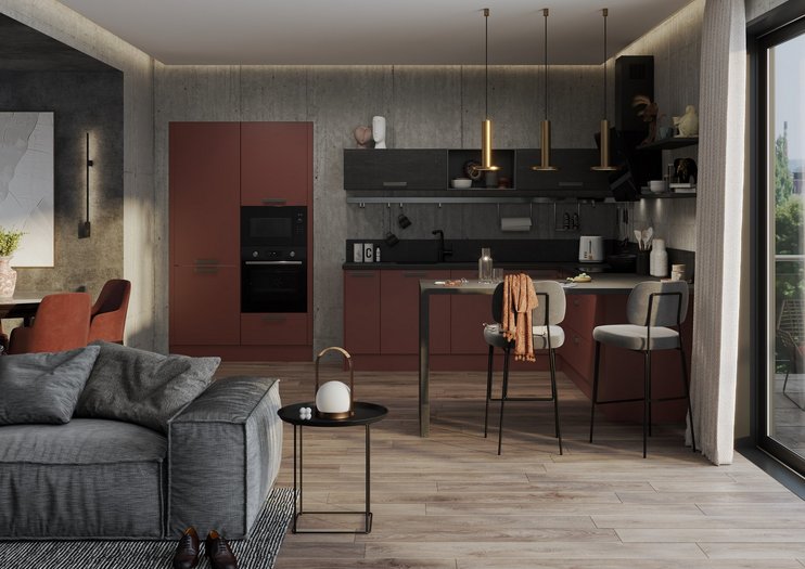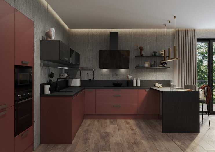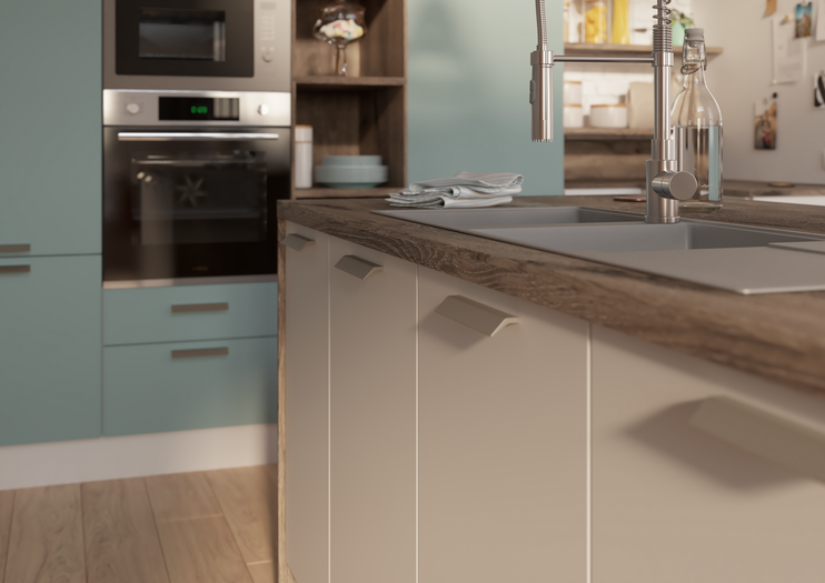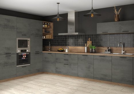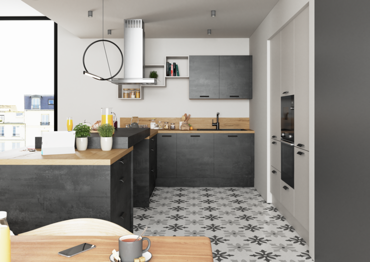 Parmi les 15 façades disponibles pour vos meubles de cuisine, 4 grandes catégories de choix : les finitions mates ou brillantes, les effets béton ou bois. Vous choisissez le style de façade qui vous plaît et vous affinez ensuite avec une gamme de couleurs qui vont du plus clair au plus foncé, selon votre style. De plus, vous pouvez coordonner la façade de vos meubles ou votre plan de travail avec le coloris de vos caissons, pour coller à la nuance près à vos envies. Grâce à cette possibilité votre cuisine profite d’une vraie unité, qui personnalise parfaitement votre univers. Avouez que ça change du noir et du blanc habituels !