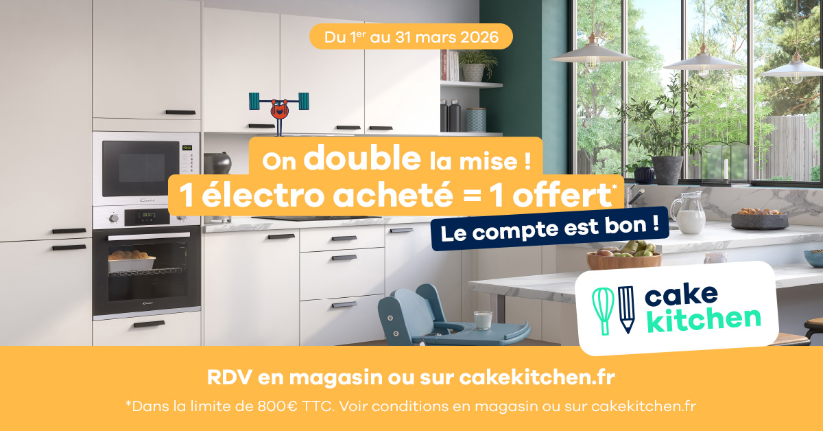 *Offre valable pour les bons de commande signés entre le 01/03/2026 et le 31/03/2026. Pour l’achat d’une cuisine équipée : un électroménager acheté, un électroménager offert (micro-onde, hotte, four, plaque de cuisson, réfrigérateur ou lave-vaisselle) (dont éco-participation), sous forme de remise, dans la limite de 800€ TTC. Le ou les électros offerts sont ceux de valeur la plus faible parmi ceux sélectionnés. Le montant de l’avantage correspond uniquement au prix du ou des électros offerts et, s’il est inférieur au plafond de 800 € TTC, aucune contrepartie financière ou remise ne sera accordée. Offre non cumulable avec d’autres offres en cours, ni avec les packs électroménagers Cake Kitchen. Offre réservée aux particuliers. Photo non-contractuelle.